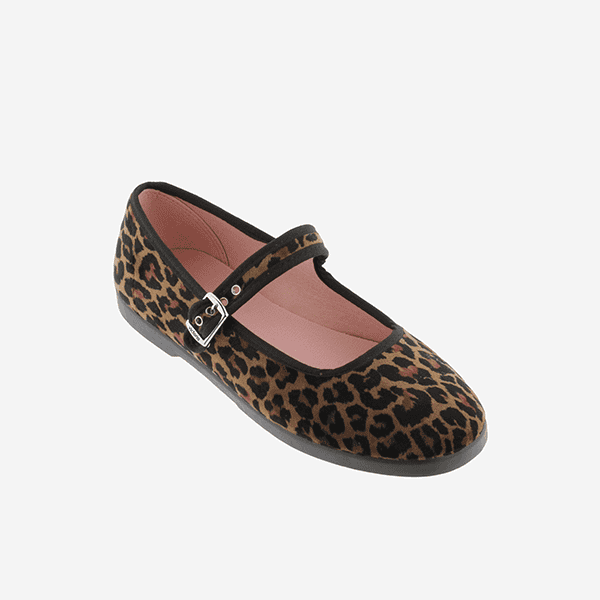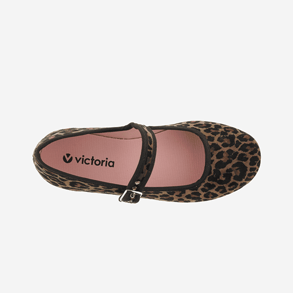 Bailarinas Victoria para niña en terciopelo con estampado leopardo. Ajuste con hebilla, tacto suave y estilo moderno para cualquier plan del día a día.