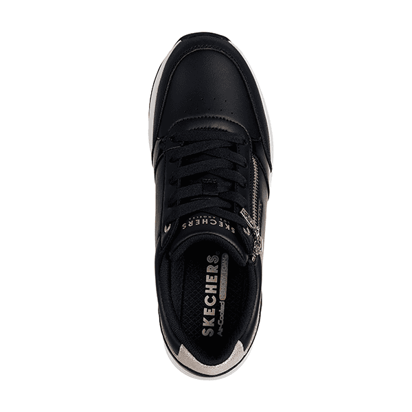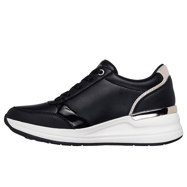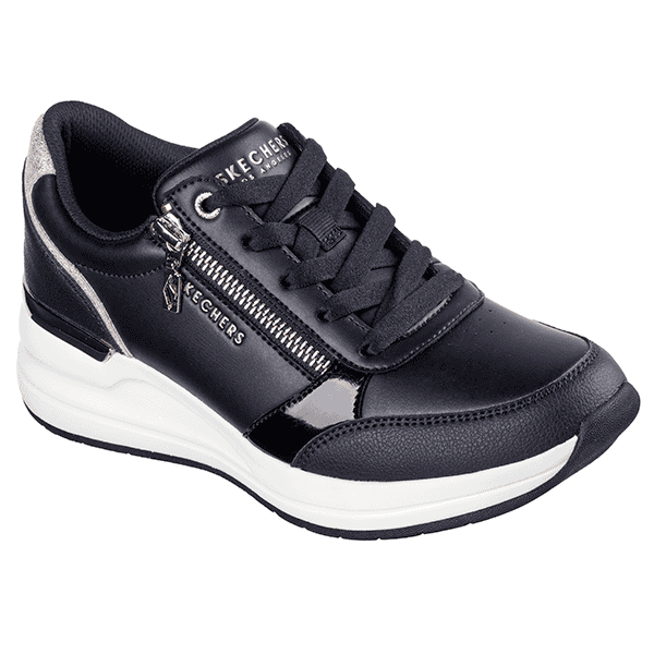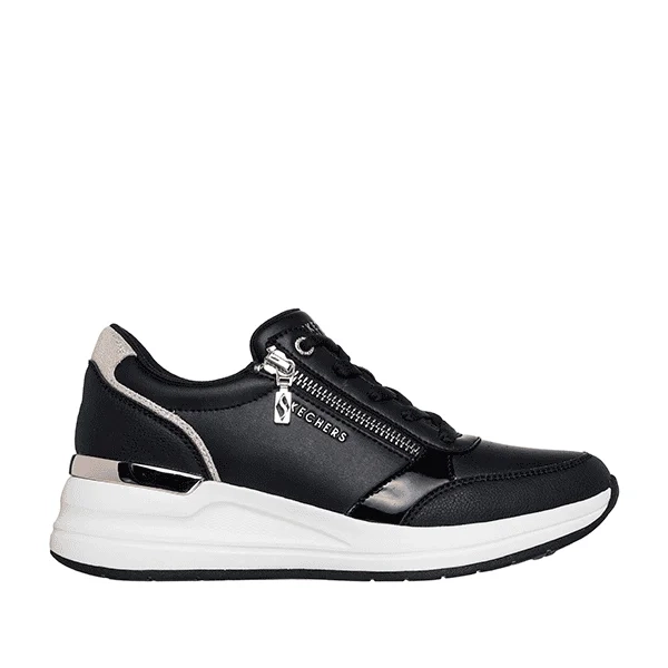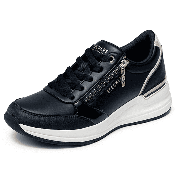 Zapatillas Skechers 177341 BLK para mujer en color negro. Diseño urbano con cuña de 4 cm, cremallera lateral y plantilla Air-Cooled Memory Foam® para máxima comodidad.