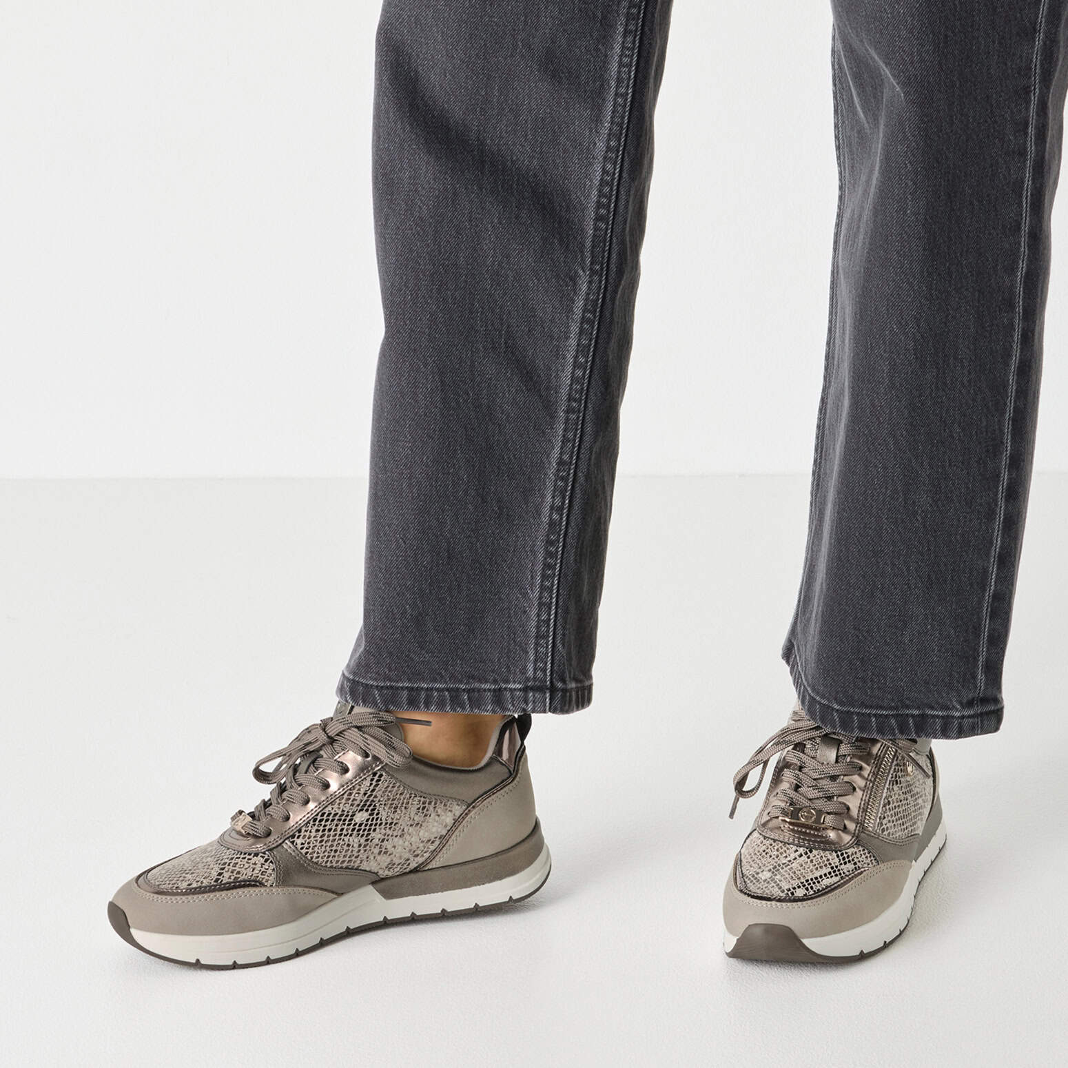 Zapatillas Tamaris para mujer en tono taupe con detalle snake. Ligeras, cómodas y con estilo urbano. Perfectas para combinar con cualquier look diario.