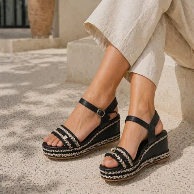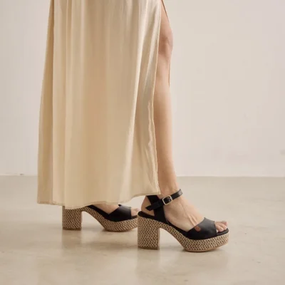 Popa Sandalia Suela De Esparto Tacón Medio Negro Arale Trenzado