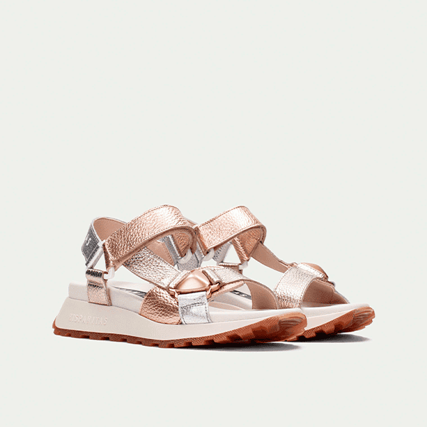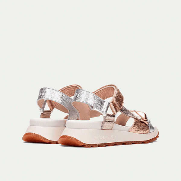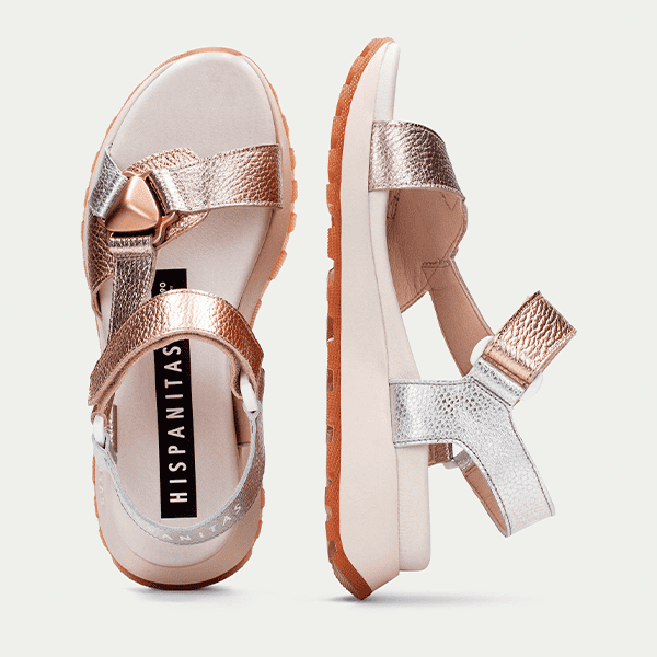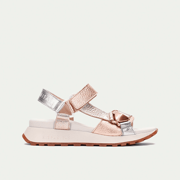 Envío gratis desde 30€Sandalia de mujer Hispanitas con suela deportiva, perfecta para un estilo cómodo y moderno. Fabricada completamente en piel, combina tonos plata y cobre metalizado para un toque sofisticado. Su cierre con velcro permite un ajuste fácil y seguro, mientras que el triple almohadillado interno proporciona una sensación acolchada en cada paso. Ligera, versátil y diseñada para el máximo confort.