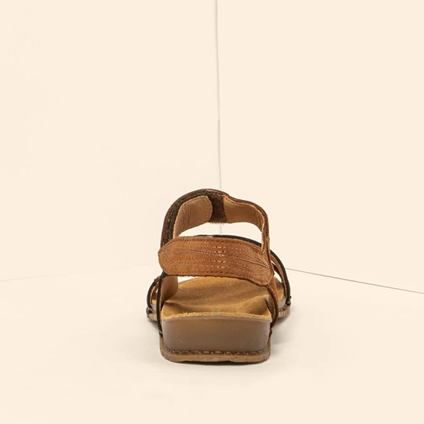 El uso de nobuck lavado en tonos kaki y cuero aporta calidez y un acabado muy natural. Estas sandalias de verano mujer combinan perfectamente con looks casuales, outfits relajados o incluso conjuntos más cuidados, aportando siempre personalidad.
