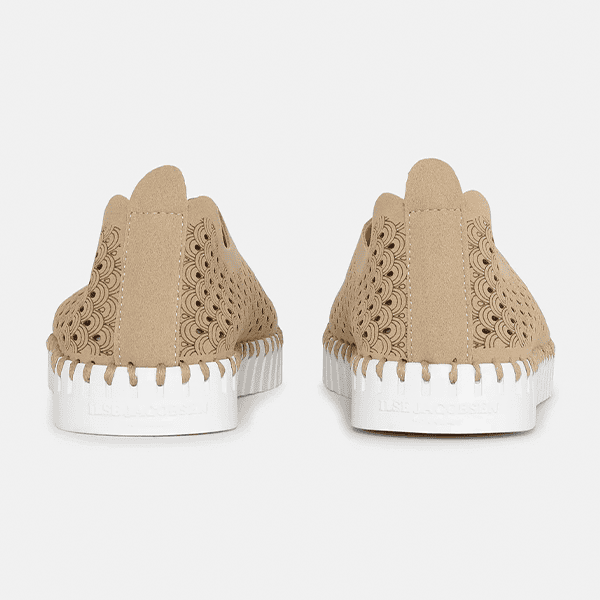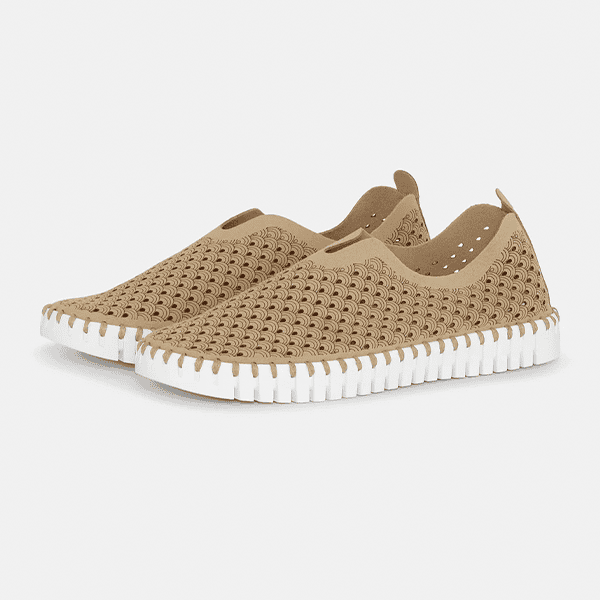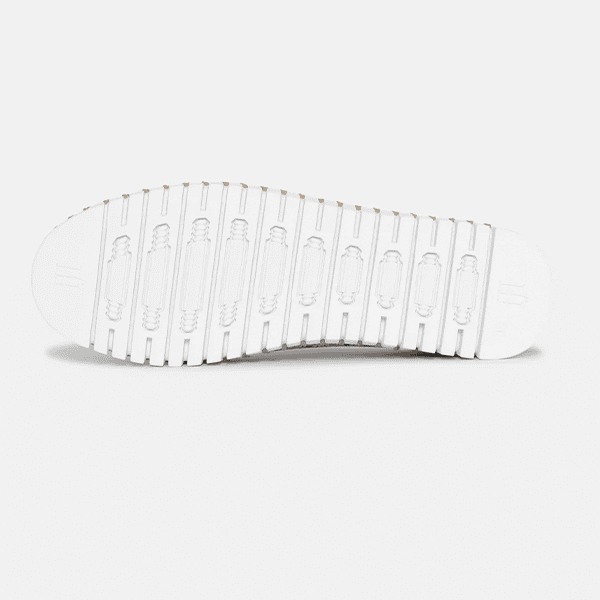 La parte superior está fabricada en microfibra reciclada. Es un material ligero, resistente y respetuoso con el medioambiente. Además, el patrón decorativo cortado al láser aporta una textura visual única que lo diferencia de cualquier otro zapato casual del mercado. No es un detalle menor: es lo que convierte un zapato funcional en un zapato con carácter.