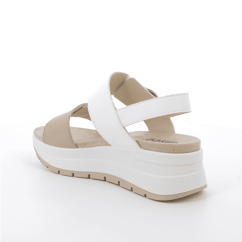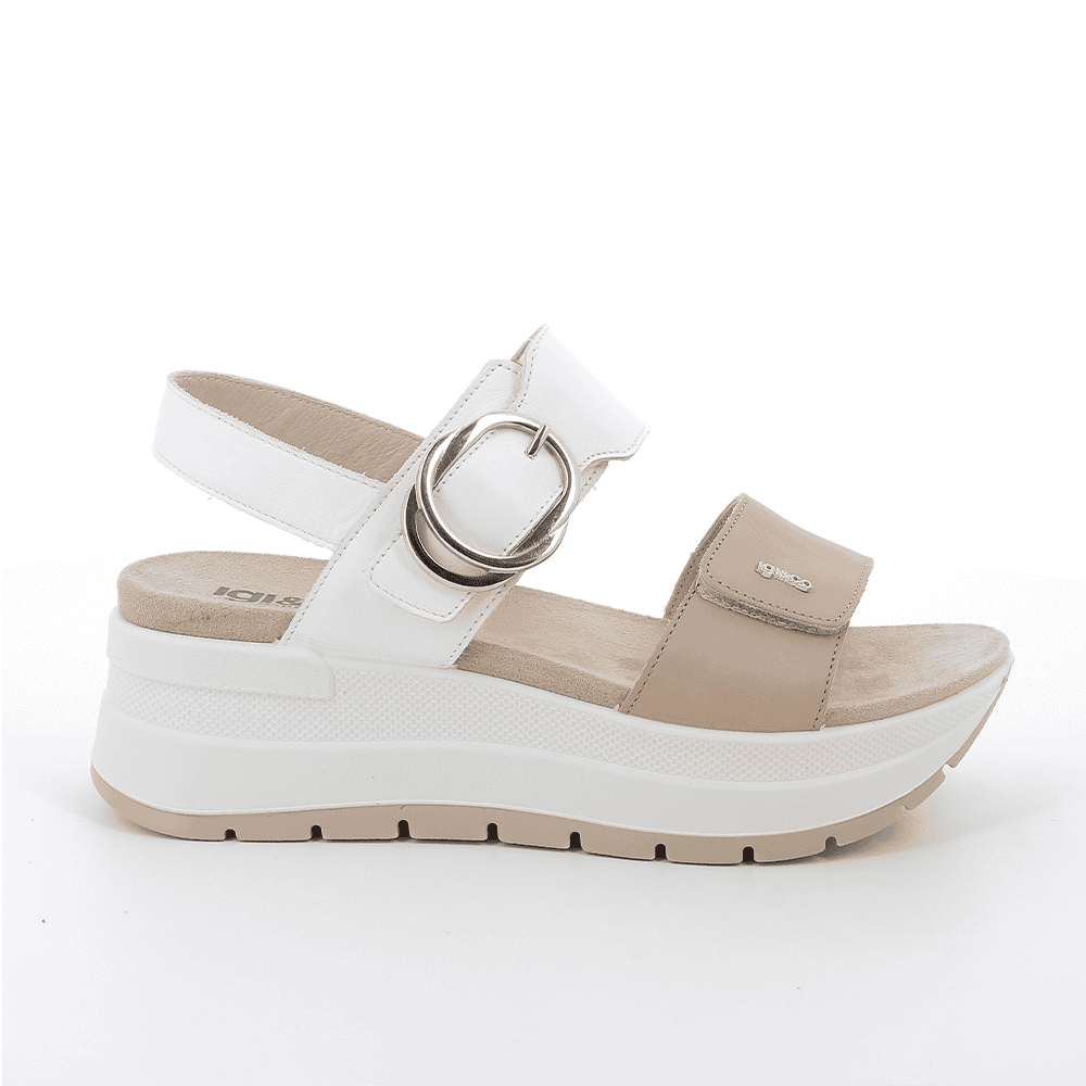 Envío gratis desde 30€Tu aliado perfecto para el verano. Sandalia de mujer IGI&CO en piel suave de color blanco, combinada con detalles en beige castoro que le dan un toque natural y elegante. Doble cierre de velcro en el empeine para un ajuste fácil y personalizado. Cuña de 6 cm con plataforma de 3 cm: altura cómoda sin esfuerzo. Su plantilla mullida ofrece una pisada suave y confortable todo el día. Perfectas para acompañarte con estilo, ya sea para un paseo o una salida especial.