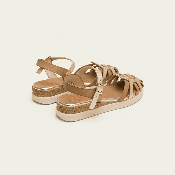 El acabado metalizado bicolor en tonos taupe y oro convierte esta sandalia en un modelo muy versátil, fácil de combinar con vestidos, faldas, pantalones cortos o largos. Es perfecta tanto para el uso diario como para planes más especiales.